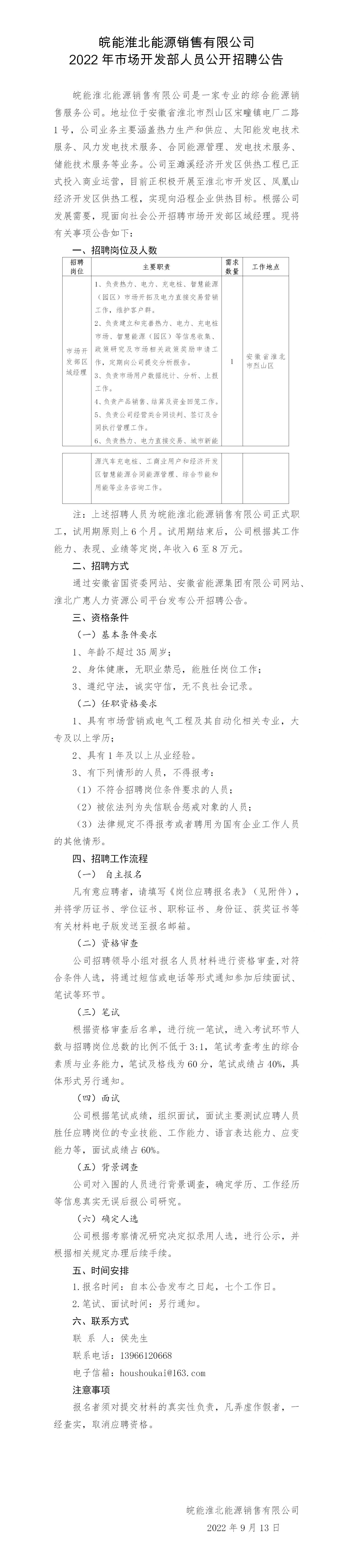 皖能淮北能源銷售有限公司2022年市場(chǎng)開發(fā)部人員公開招聘公告