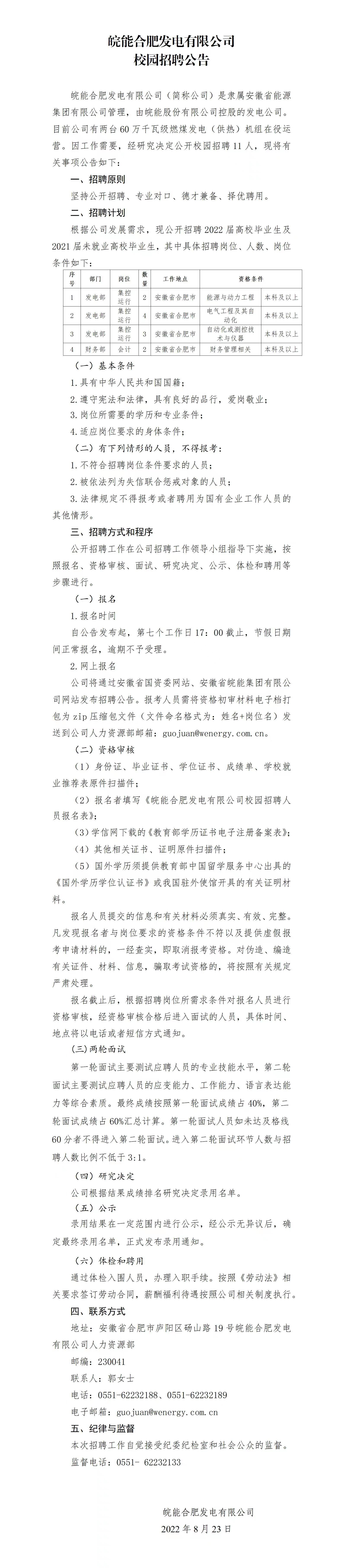 皖能銅陵發(fā)電有限公司校園招聘公告