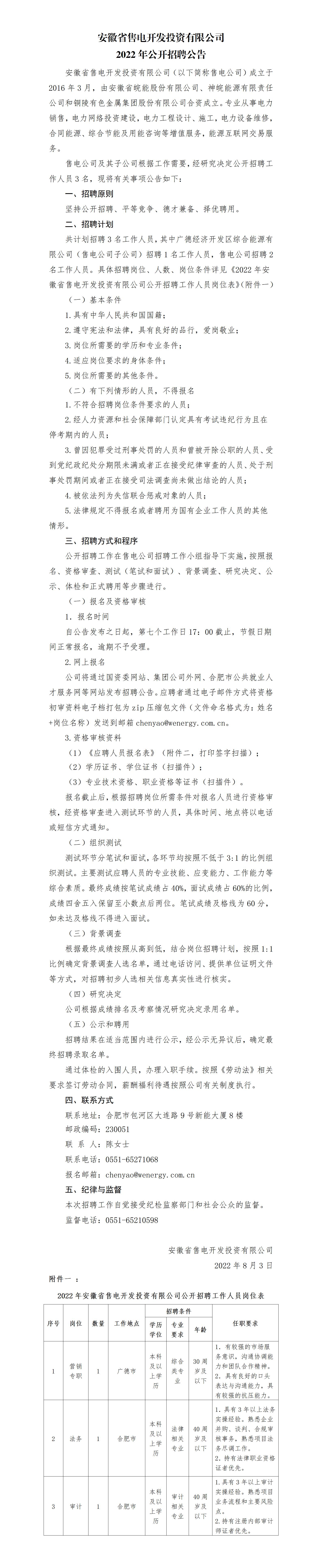 安徽省售電開發(fā)投資有限公司2022年公開招聘公告