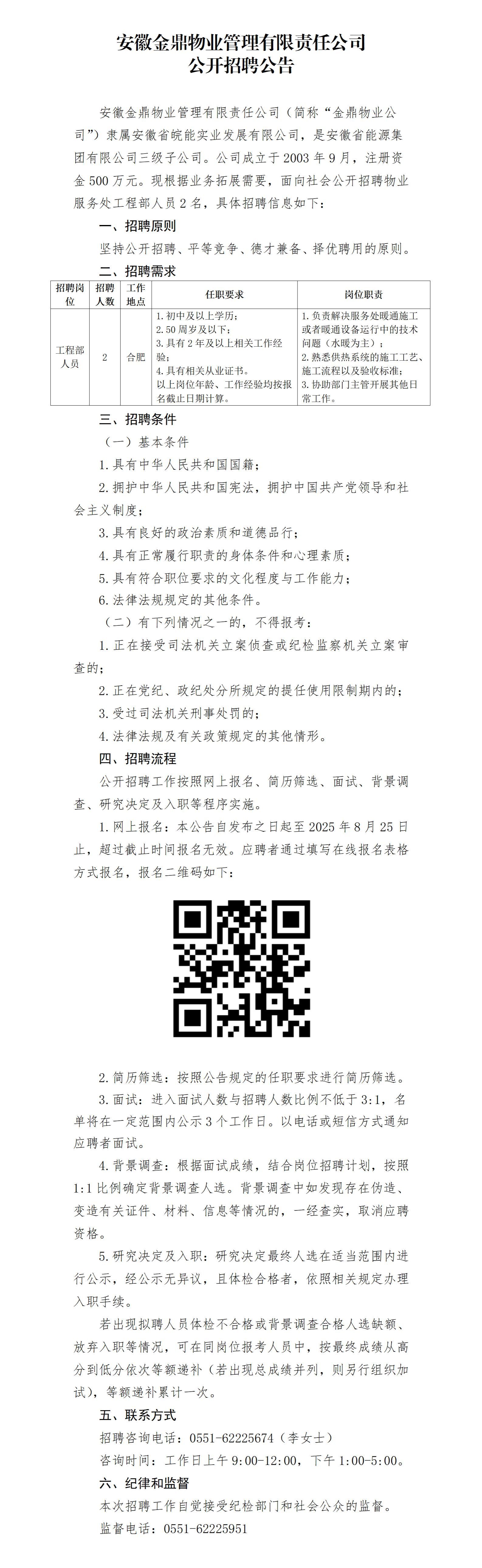 安徽金鼎物業(yè)管理有限責(zé)任公司社招公告