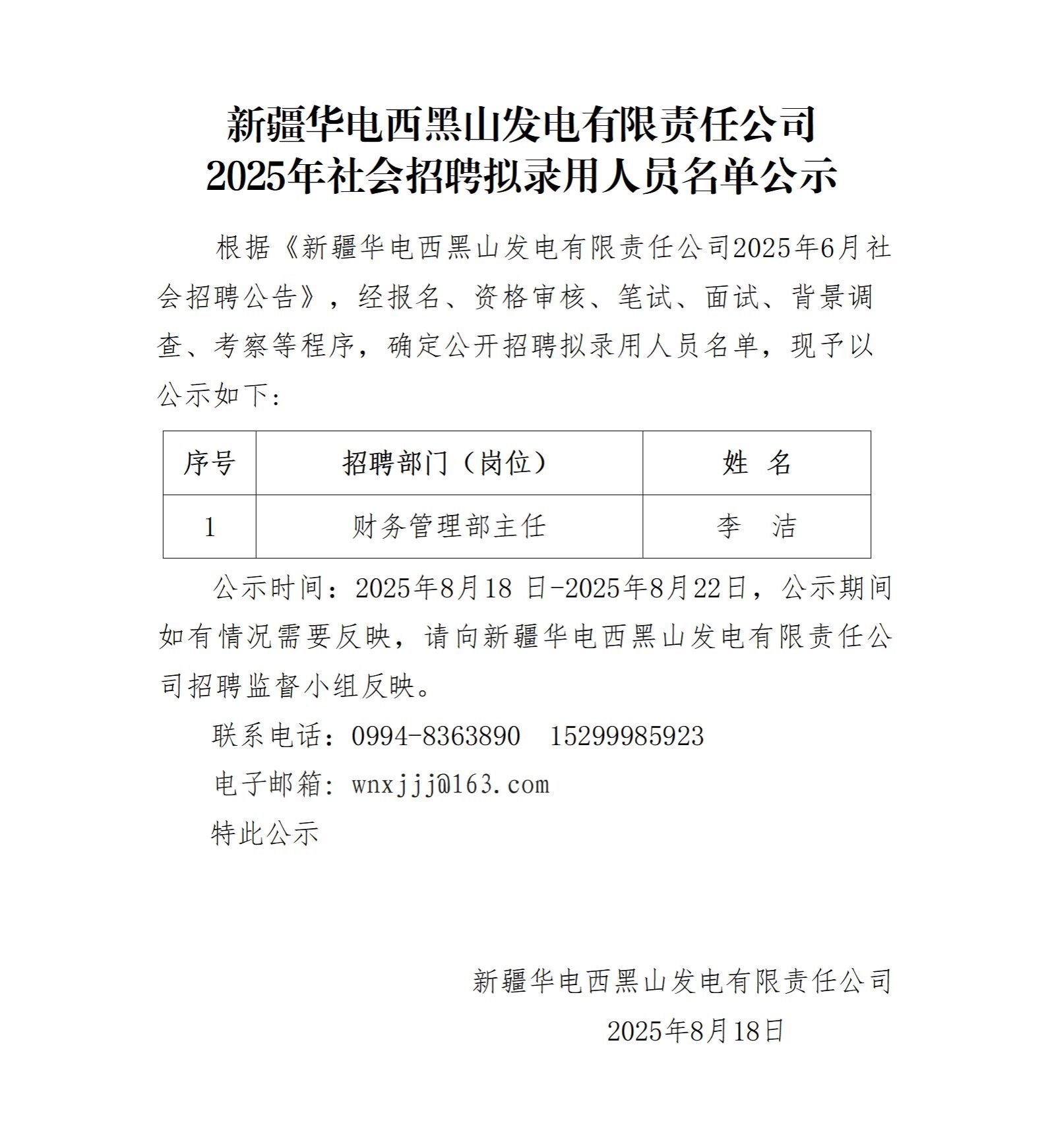 新疆華電西黑山發(fā)電有限責任公司2025年社會招聘擬錄用人員名單公示