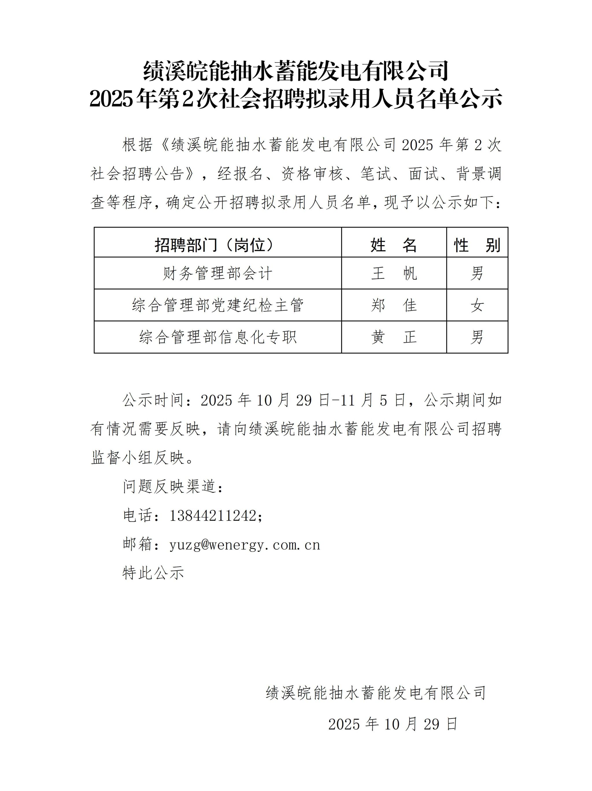 績溪皖能抽水蓄能發(fā)電有限公司2025年第2次社會招聘擬錄用人員名單公示